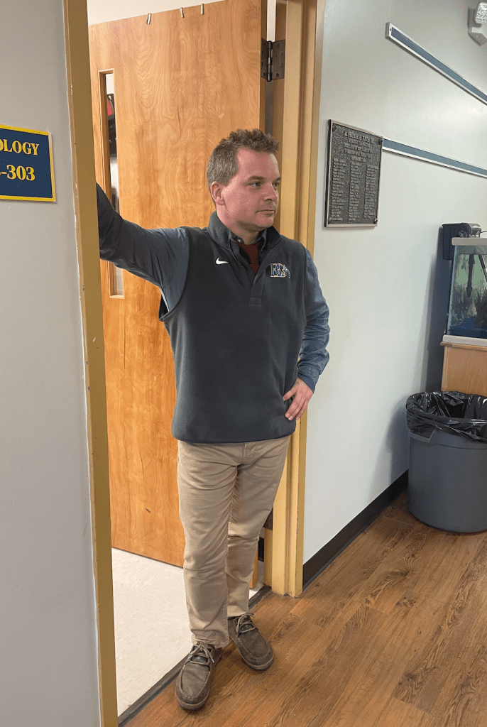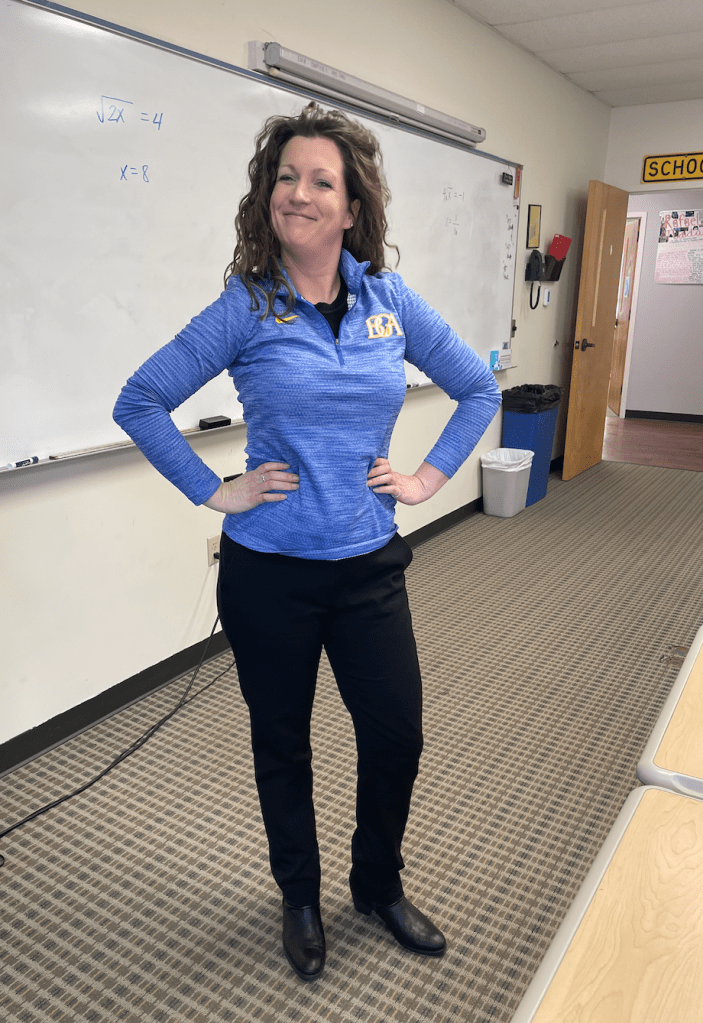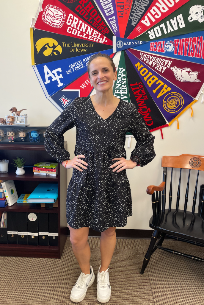 First up on our best-dressed teachers list, we have Ms. Borden. She is wearing a polka-dot dress along with some Nike shoes. Her outfits are always fun and colorful and fit her personality so well! Every day, she always has something fashionable on!