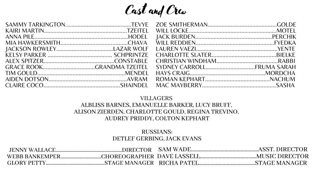 Fiddler on the Roof, set in the late-19th century Russian Jewish countryside, tells the story of a community on the precipice of change. Tevye (Sammy Tarkington), an impoverished milkman works, struggles, and tries to provide for his wife Golde (Zoe Smitherman) and their 5 daughters (Kairi Martin, Anna Pile, Mia Hawkersmith, Kelsy Parker, Charlotte Slater). As widespread oppression and pogroms overtake surrounding communities, Tevye and the village of Anatevka hold onto each other and their heritage as a war on the Jewish people threatens to tear them apart. Their cultural norms also continue to be challenged within the village as Tevye’s daughters attempt to subvert society and find modern love, leaving Tevye to upend the very thing he’s trying to preserve: tradition.